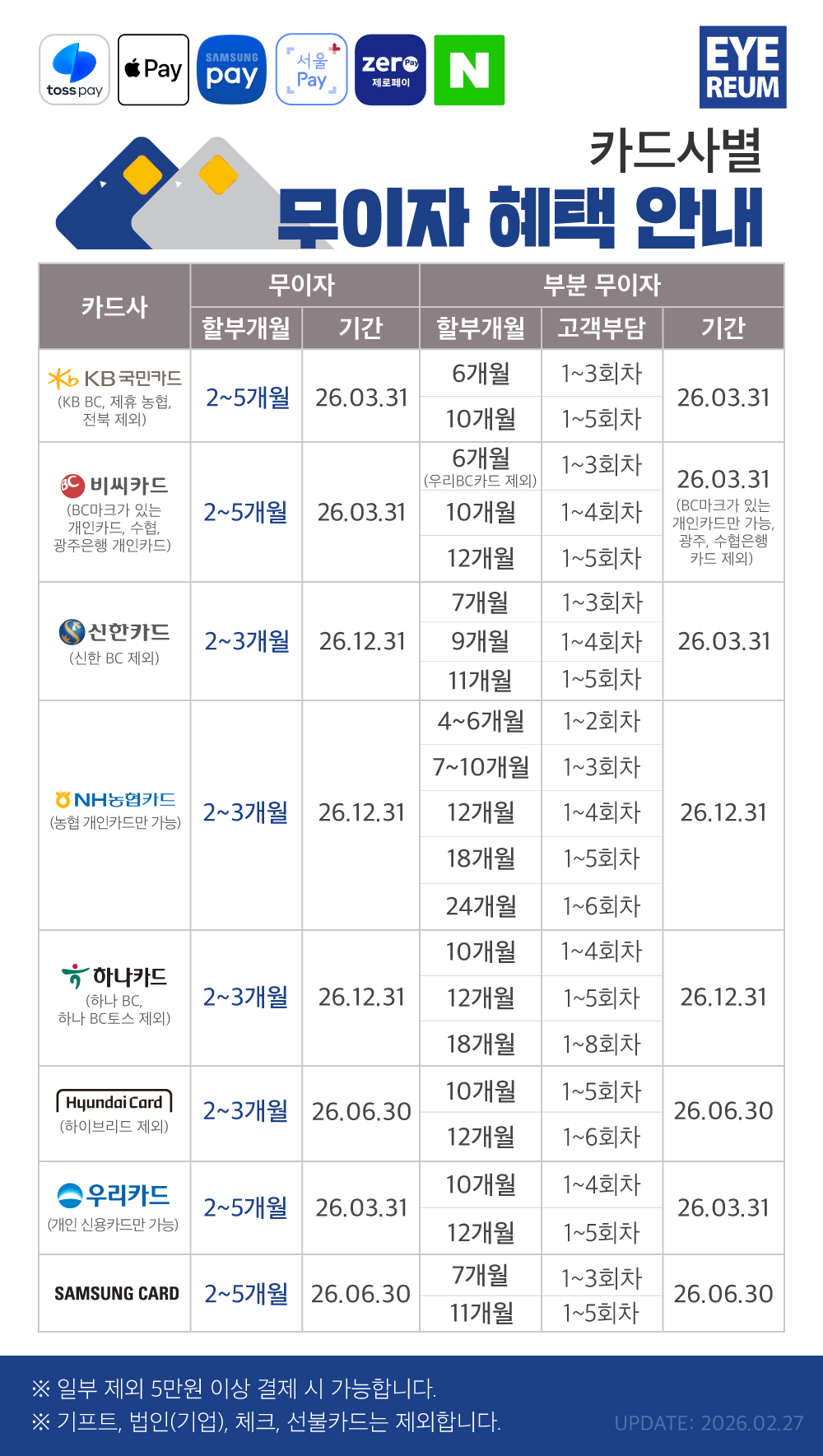 아이리움안과 카드사별 무이자 할부 및 간편결제 안내