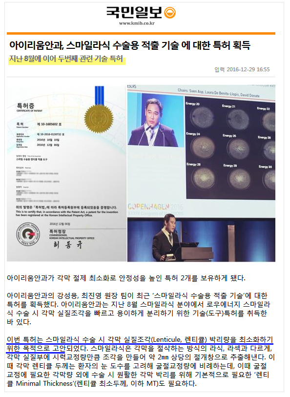 스마일라식에 대한 두 번째 국내 특허권을 획득했습니다.