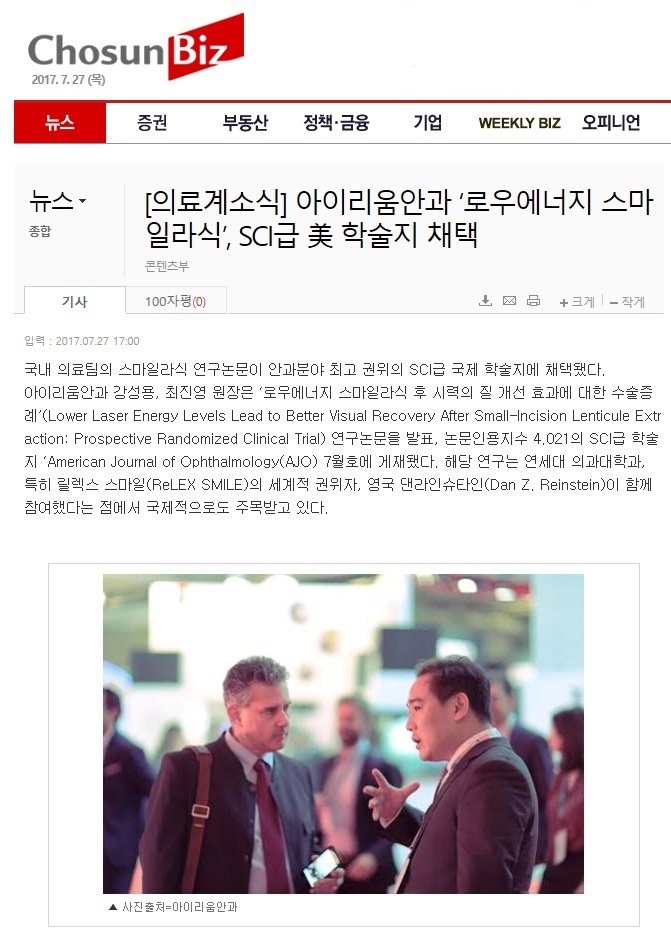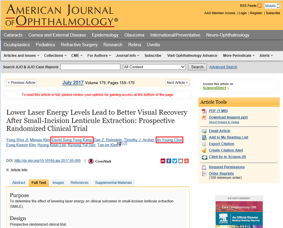 [논문] 로우에너지 스마일라식 시력의 질 향상 효과, SCI 급 AJO에 수록