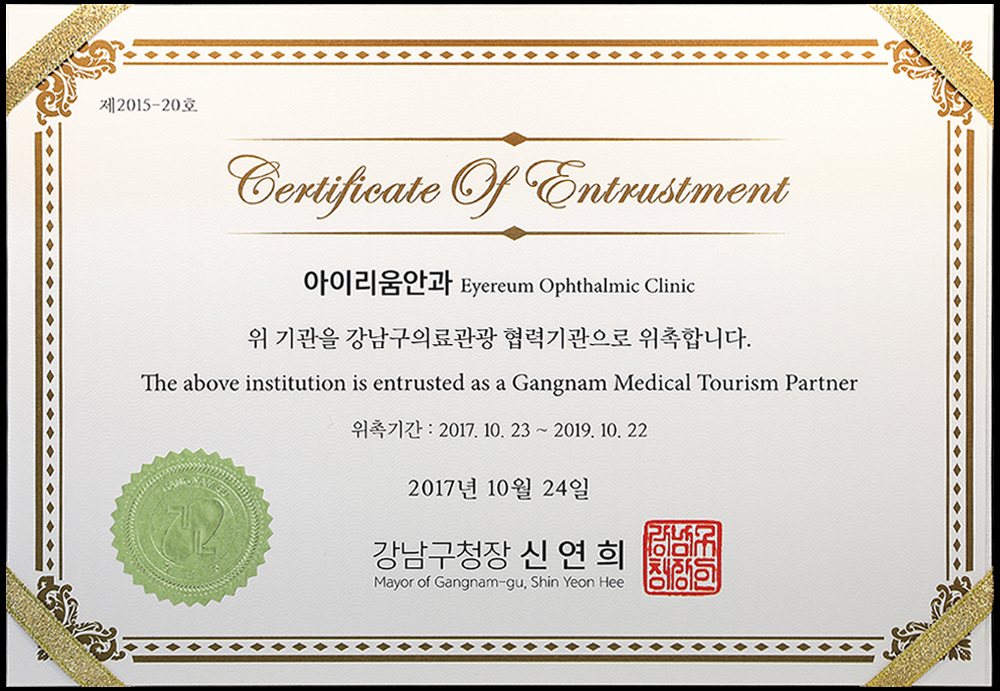 아이리움안과가 강남구 의료관광 협력기관으로 지정되었습니다.