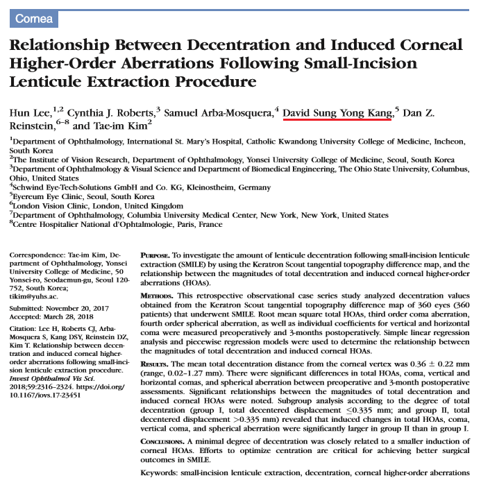 [논문] 로우에너지 스마일라식 센트레이션 연구논문, SCI 학술지 iOVS 등재