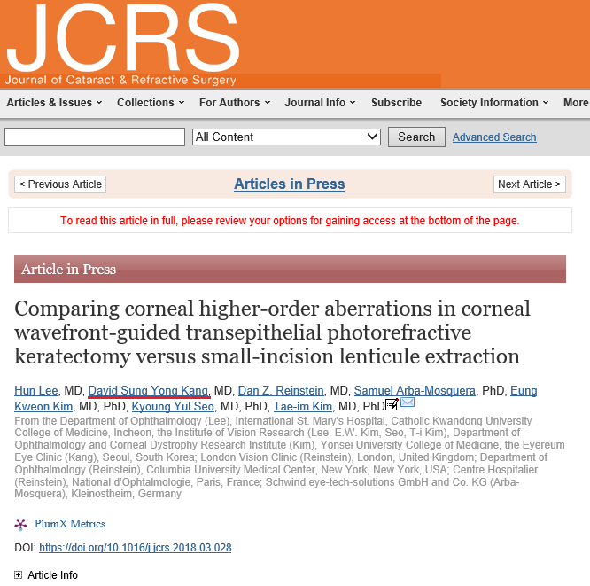 SCI 학술지 JCRS(Journal of Cataract & Refractive Surgery)에 등재됐습니다.