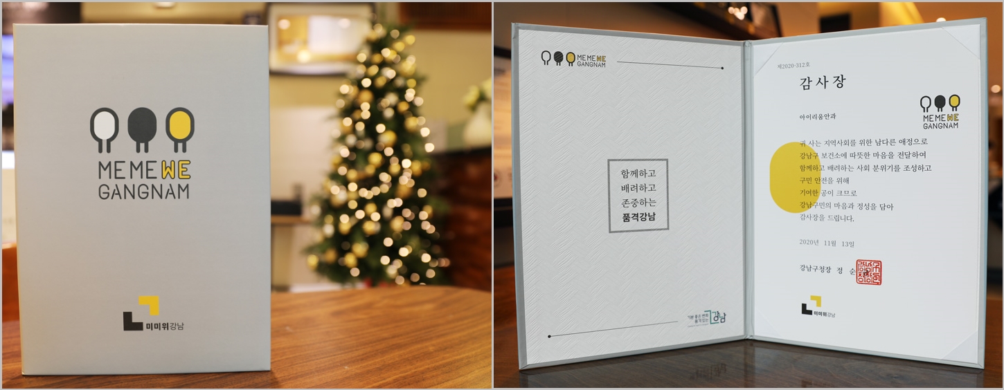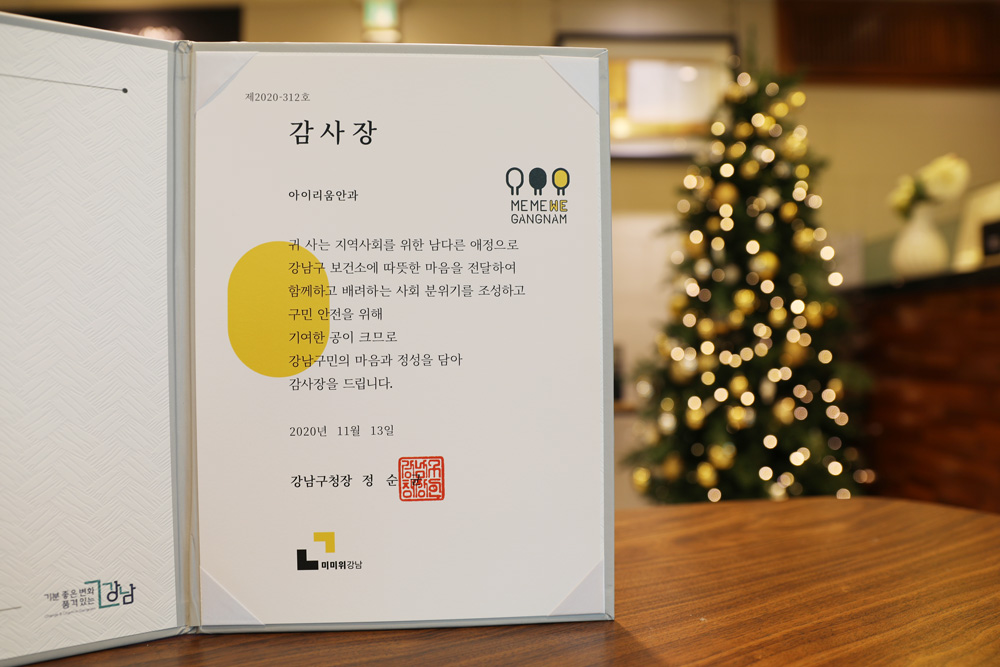 감사하게도 아이리움안과도 수상 단체로 감사장을 받게 되었습니다.