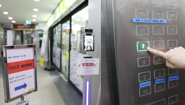 건물 진입로에서 정상체온(1차 체온측정) 확인 후