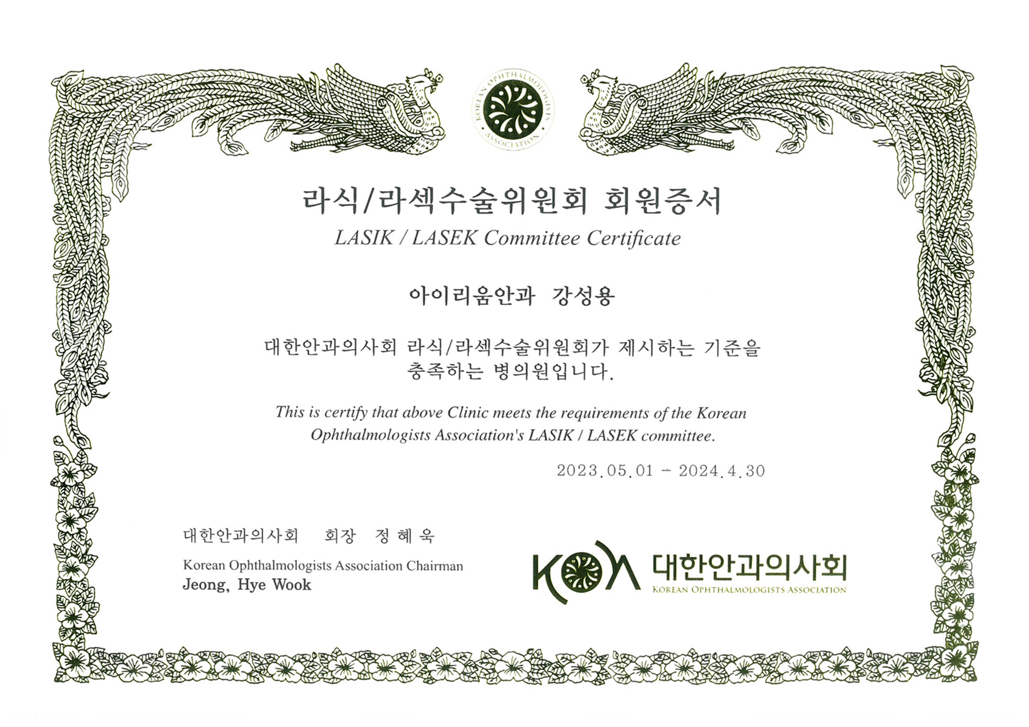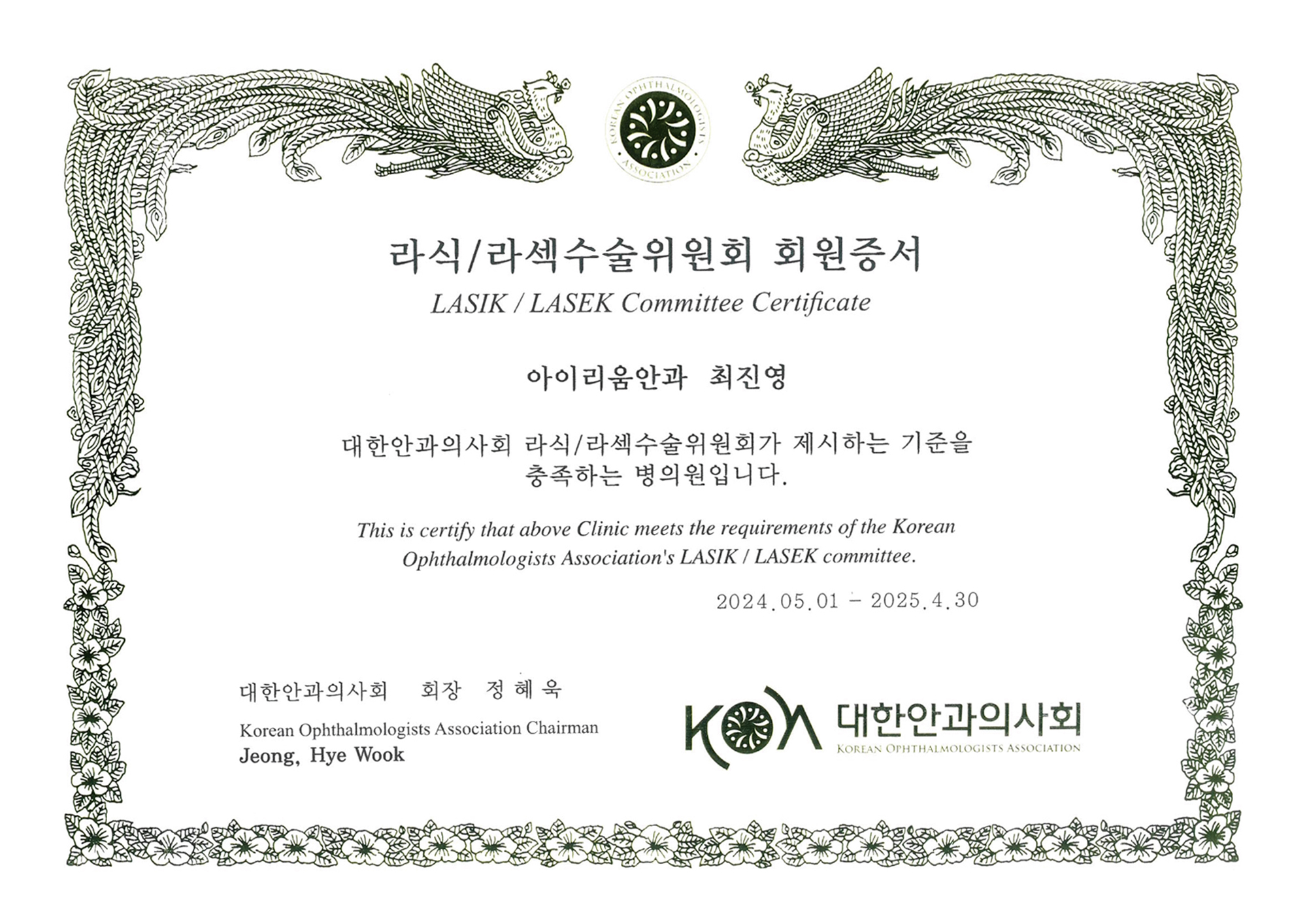 [소식] 대한안과의사회 라식/라섹수술 병의원 회원, 아이리움안과