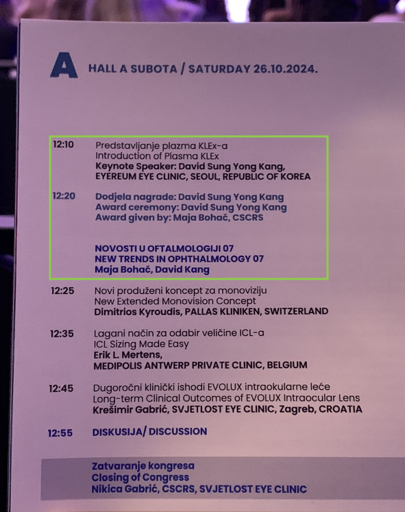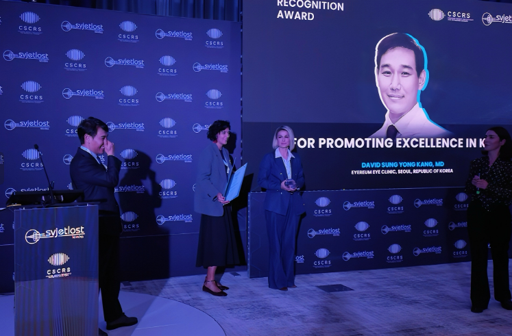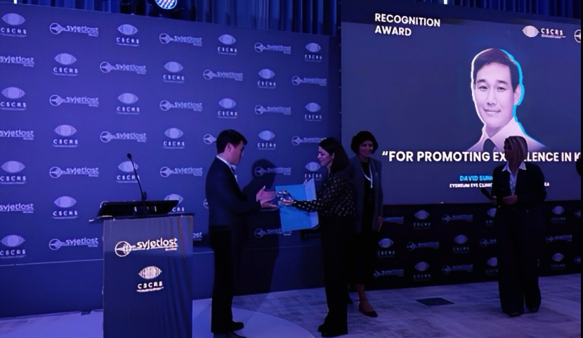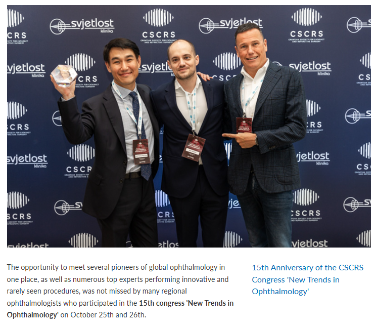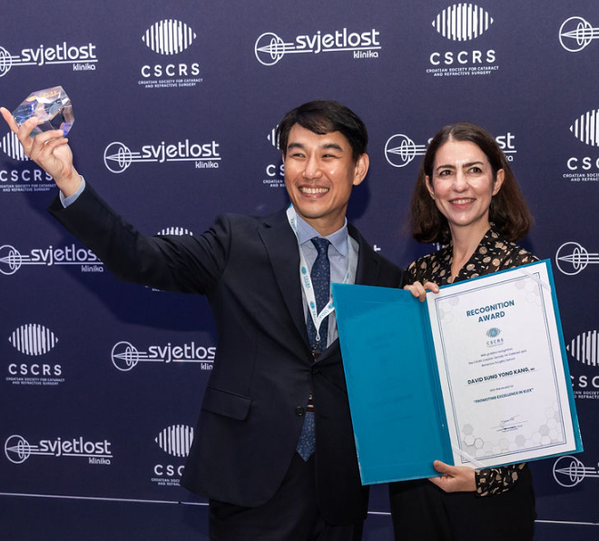 "At the congress Associated Maja Bohač, MD,PHD presented the award to David Sung Yong Kang, MD, who is the surgeon who performed the 3rd generation laser diopter reduction procedures and who is considered by many to be one of the most successful, fastest and most influential surgeons in the world." (출처: svjetlost.hr,27.10.2024)