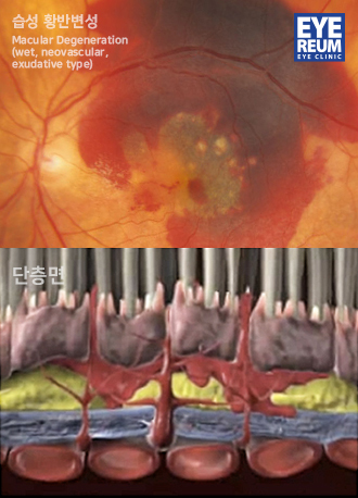 습성 황반변성(wet, neovascular, exudative type)은 망막 밑에 맥락막 신생혈관이 자라서, 이 신생혈관 자체 또는 혈관으로부터의 출혈, 삼출 등에 의해 심한 시력 손상이 발생하기 쉬우며, 발병 후 수개월~수년 사이에 원반형 위축, 심한 출혈 등으로 실명을 초래할 수 있습니다.