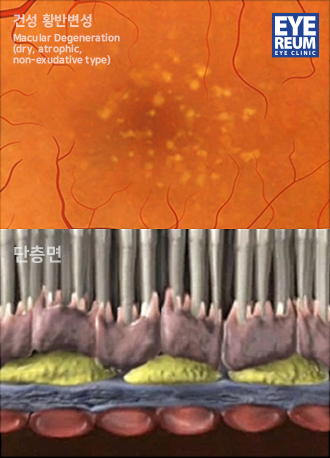 건성 황반변성(dry, atrophic, non-exudative type)은 망막에 드루젠이나 망막색소상피의 위축과 같은 병변이 생긴 경우를 말합니다.