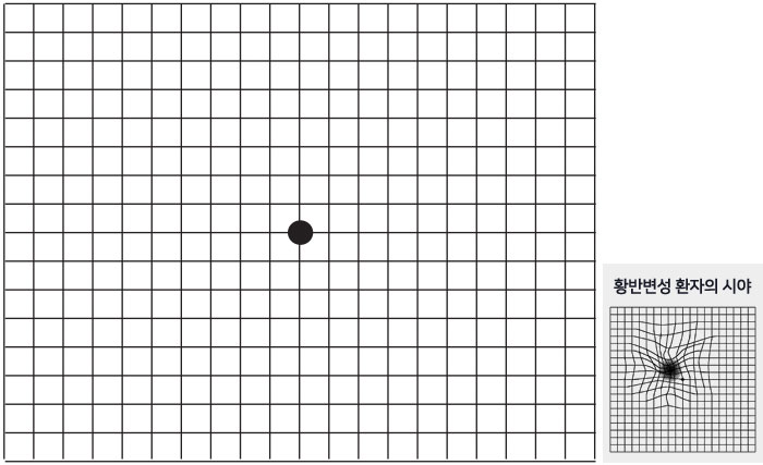 - 만약 선들이 물결치거나, 비어있거나, 뒤틀어려지거나 희미한 부분이 있다면 황반변성을 의심할 수 있습니다.