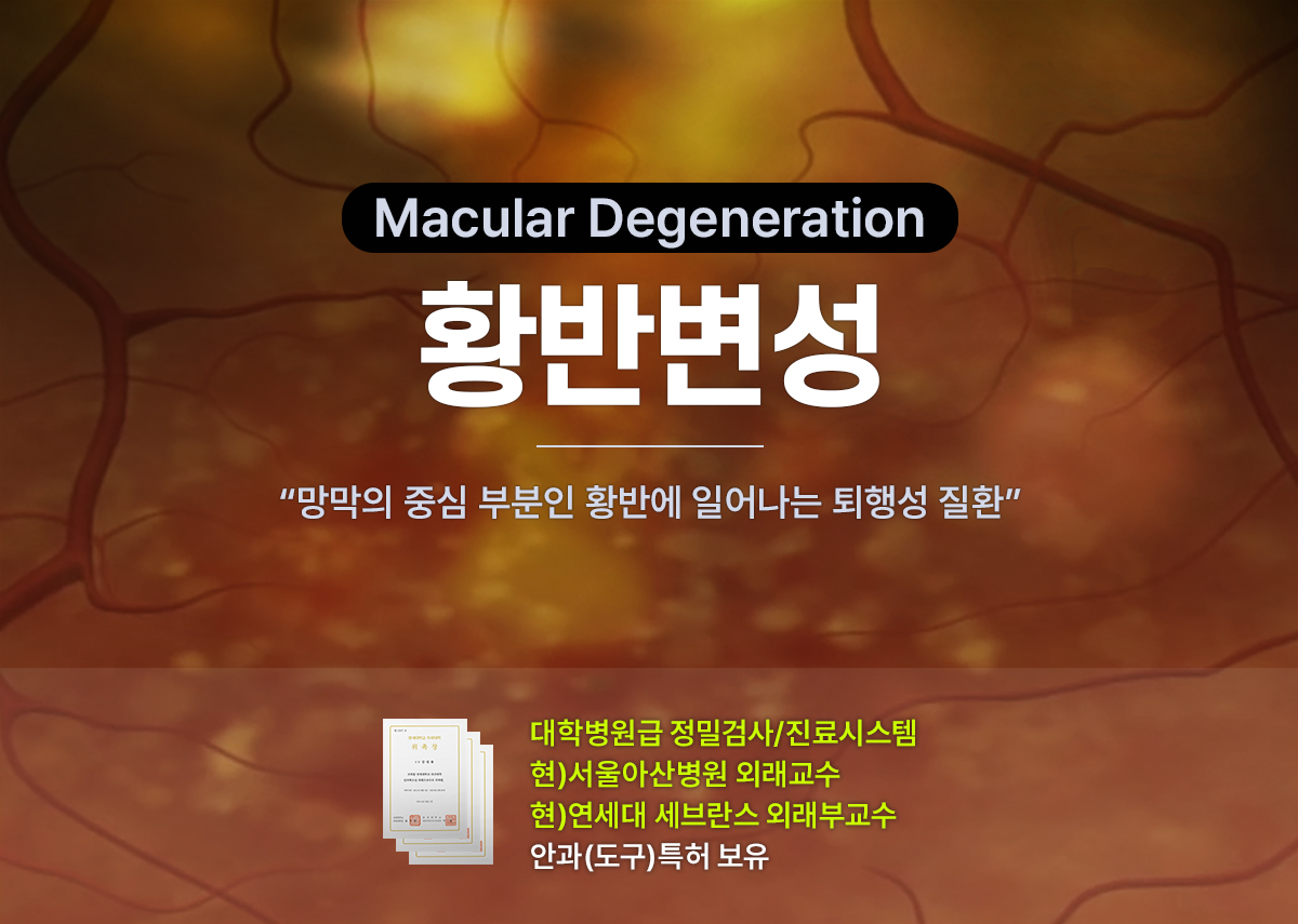 황반변성은 망막의 중심 부분인 황반에 일어나는 퇴행성 질환입니다. 황반의 구조와 기능에 이상이 발생, 시력감소 또는 시력 상실이 초래되는 질병으로 보통 50, 60대에 나타나지만 드물게 젊은 연령층에서 발병하기도 합니다.
