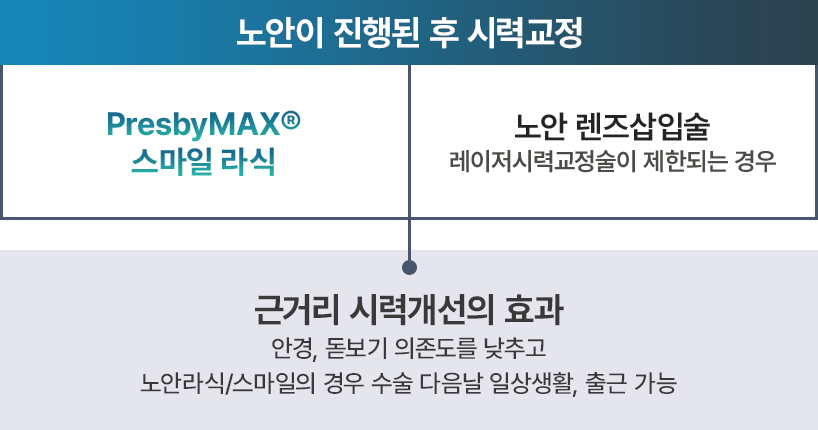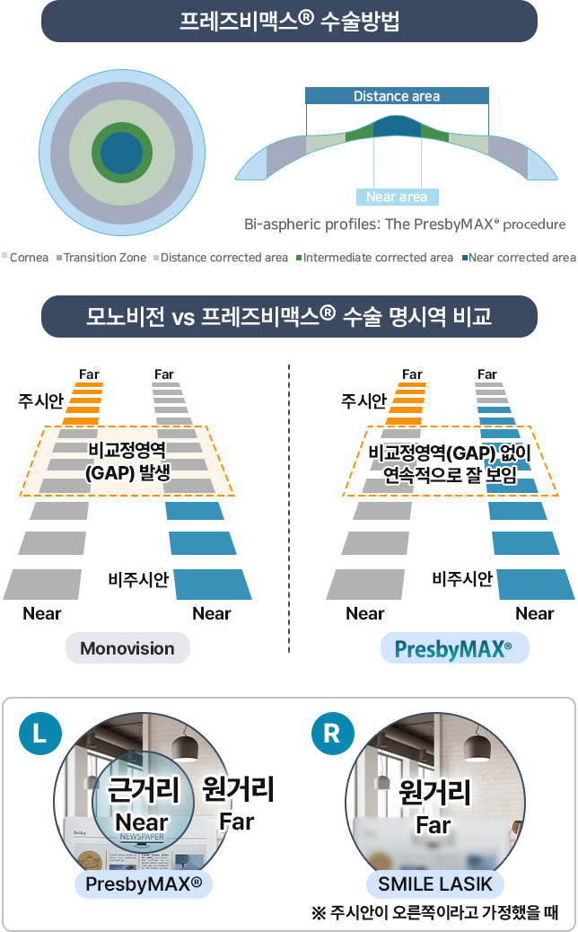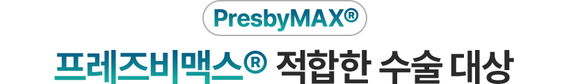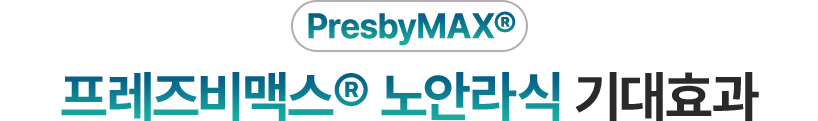 주시안은 스마일, 라식으로 정시로 교정, 비주시안은 ‘프레즈비맥스®’ 수술로 다초점 각막 표면을 만들어 각막 중심부는 근거리를, 각막 주변부는 원거리를 보도록 교정합니다.