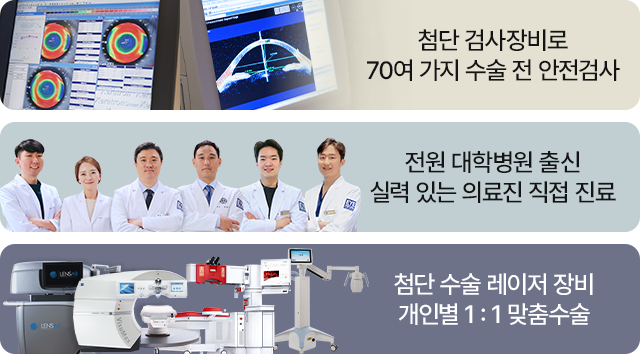40-50대에 노안이 진행된 후 시력교정술을 계획한다면 70여가지 수술전 검사 결과를 토대로 노안과 기존 근시, 난시를 함께 교정하기 위한 개인별 맞춤 수술방법을 결정합니다.