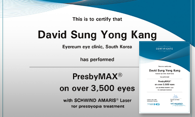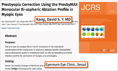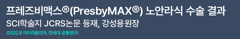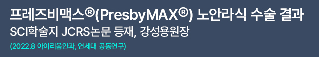 “프레즈비맥스 노안라식은 수술 후 원거리와 근거리 모두 우수한 단안 및 양안 나안시력을 제공할 수 있습니다. 또한 양안 노안시술을 받는 것보다 단안 프레즈비맥스와 단안 라식 결합으로 원거리 시력에 유리할 수 있습니다.”